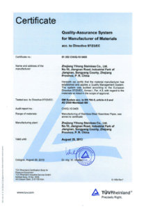 公司嚴格按ISO9001:2015《質量管理體系—要求》、ISO14001:2015《環境管理體系 要求及使用指南》、ISO 45001:2018《職業健康管理體系 要求及使用指南》和TSG 07—2019《特種設備生產和充裝單位許可規則》,建立完善的管理體系。公司擁有國內較大的12000KN冷拔機組和先進的全溫控不銹鋼固溶退火爐等生產設備,同時具有ET16-159渦流探傷儀、UT16-159超聲波探傷儀、UT159-830超聲波探傷儀、H159-630水壓試驗機、WAD—600液壓材料試驗機、4XB電腦金相顯微鏡、JQ—300沖擊試驗機、HBRVU—187.5硬度計、島津光譜儀、化學分析儀、晶間腐蝕試驗等完善的檢測設備。
